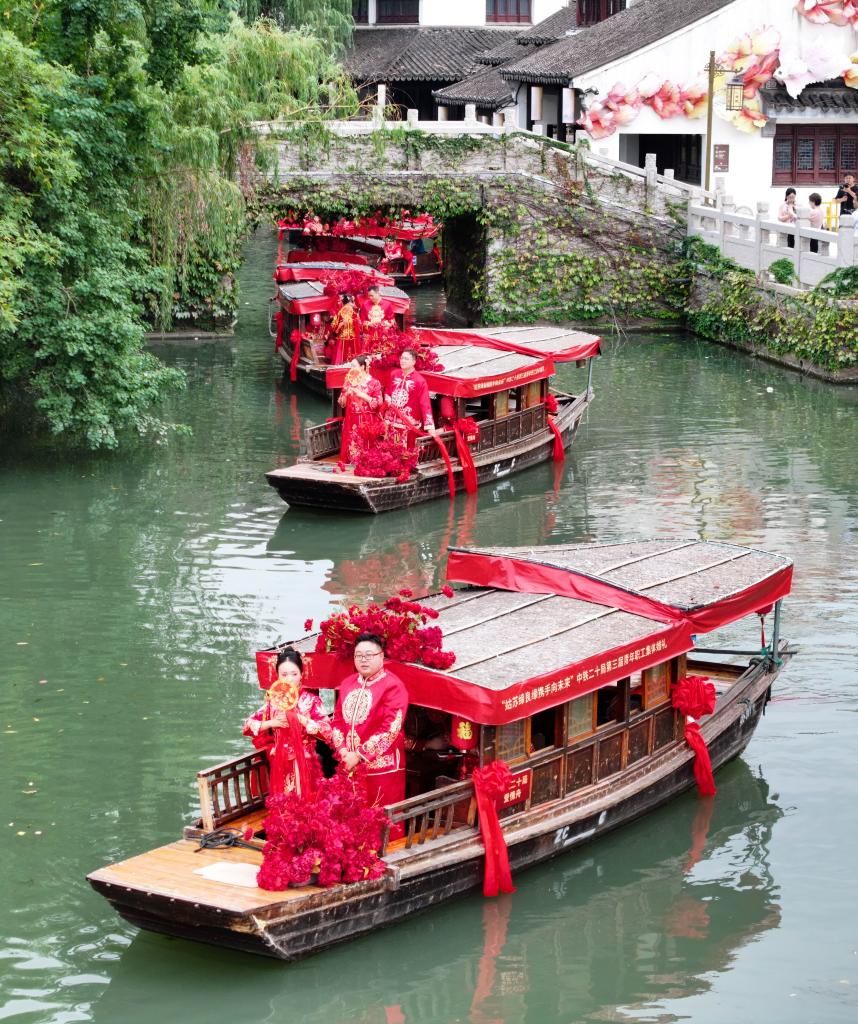 9月29日、甪直古鎮を舟で巡る新郎新婦。(ドローンから、蘇州=新華社記者/季春鵬)