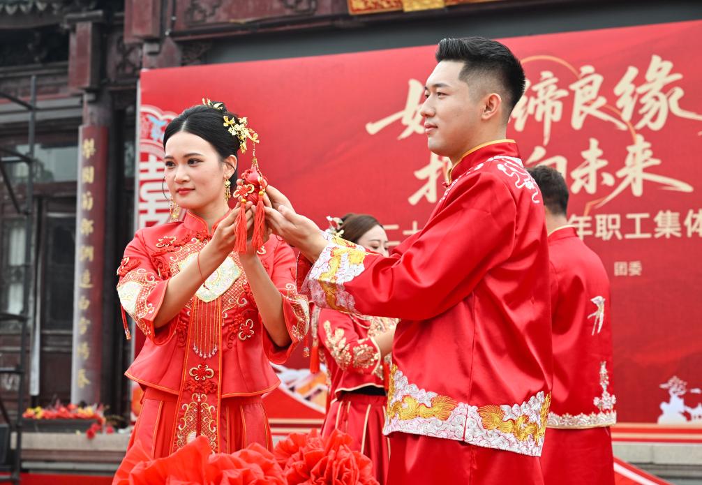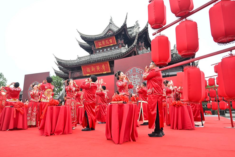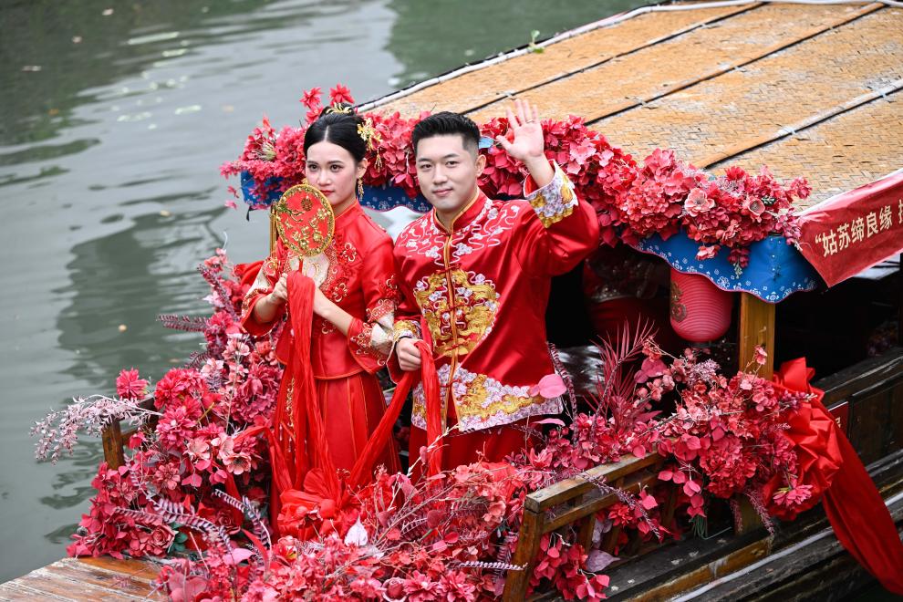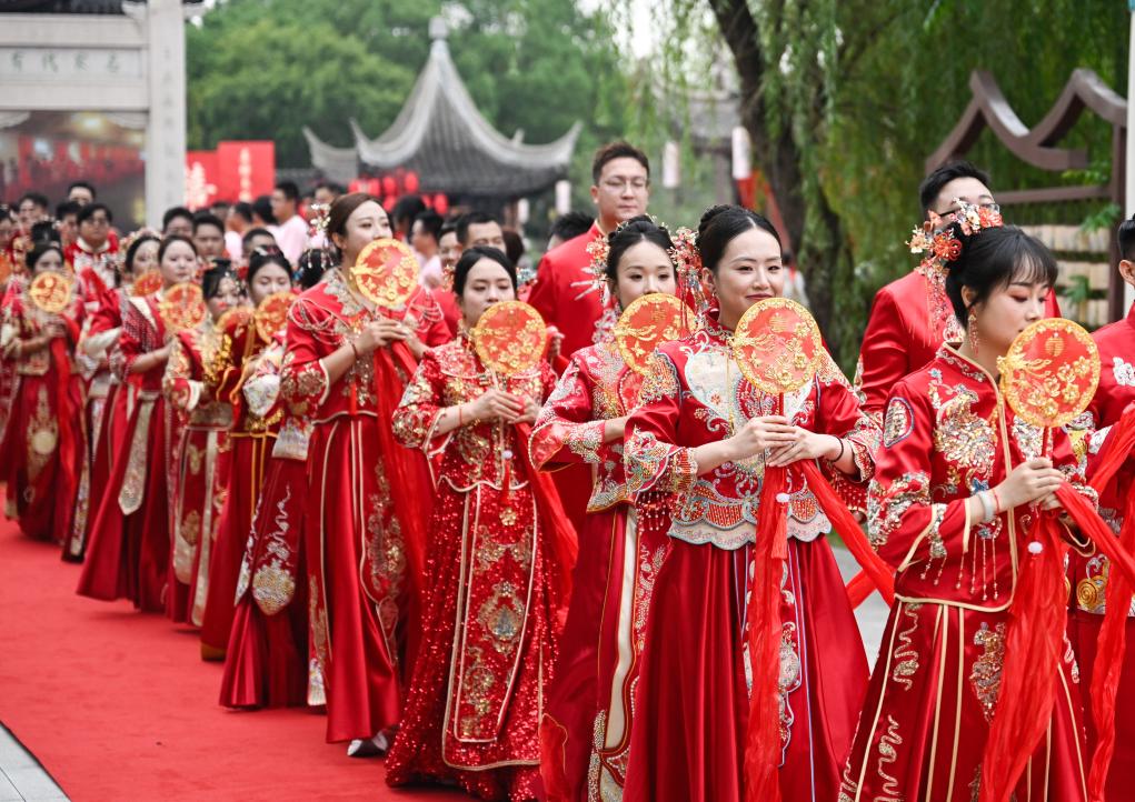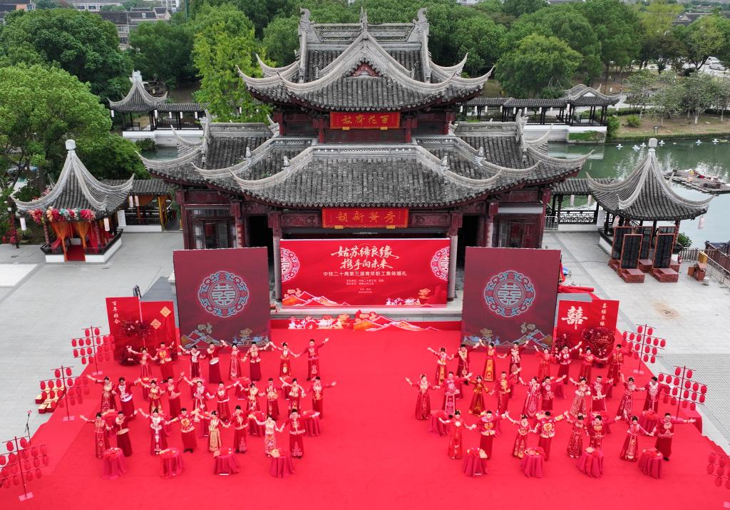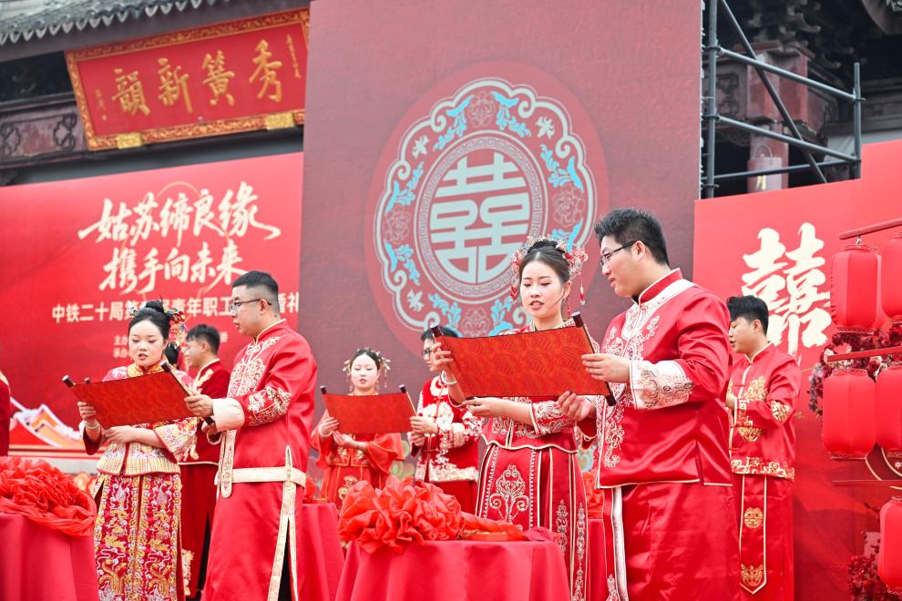 【新華社蘇州10月1日】中国江蘇省蘇州市の甪直(ろくちょく)古鎮で9月29日、インフラ建設大手、中国鉄建傘下の中鉄二十局集団が若手従業員の合同結婚式を開催した。「蘇州で良縁を結び、手を携え未来へ」と題した式では、新郎新婦26組が伝統衣装に身を包み、共に結婚証を読み上げた。