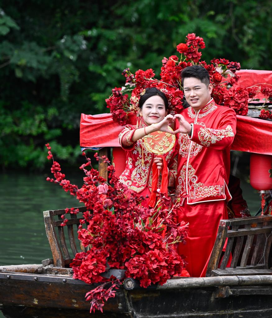 9月29日、甪直古鎮を舟で巡る新郎新婦。(蘇州=新華社記者/季春鵬)