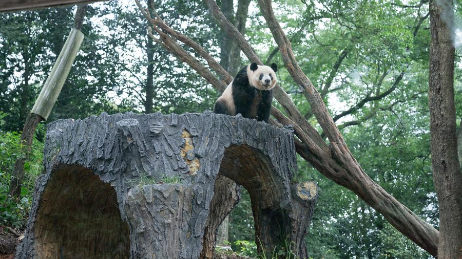 【新華社成都10月1日】中国四川省雅安市にある中国ジャイアントパンダ保護研究センター雅安碧峰峡基地で、日本生まれのパンダ、シャンシャン(香香)が大型遊具に登り、リラックスした姿を見せた。