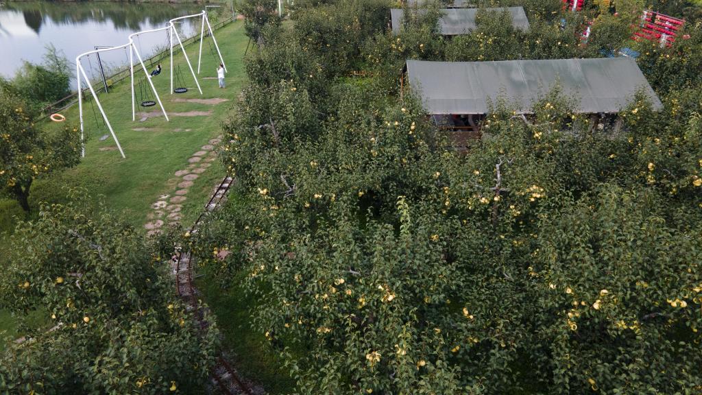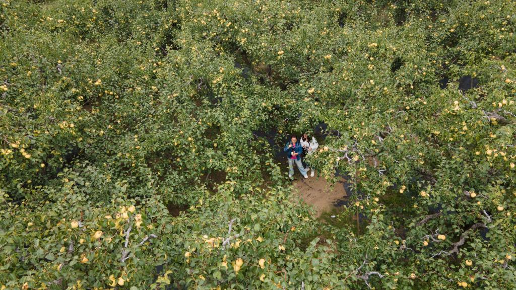 9月18日、碭山県の梨園を散策する観光客。(ドローンから、宿州=新華社記者/張端)