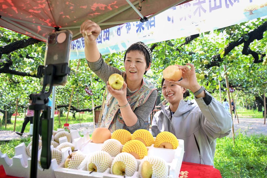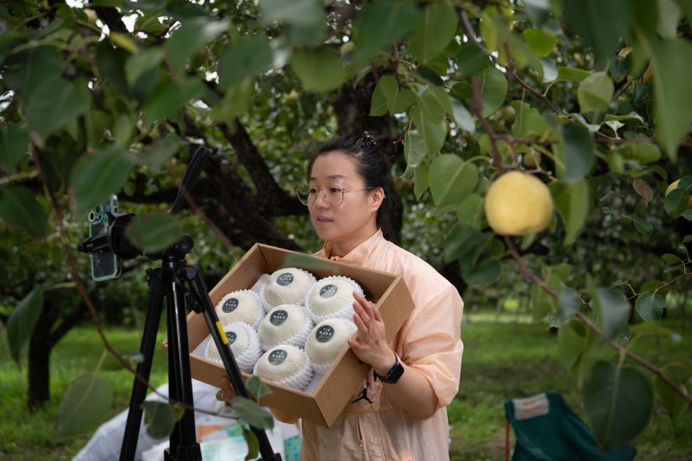 9月18日、碭山県の梨園で、ライブ配信を通じて酥梨を販売する起業家。(宿州=新華社記者/張端)