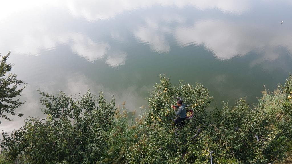 9月20日、碭山県の梨園で、酥梨を収穫する農家の人。(ドローンから、宿州=新華社記者/張端)