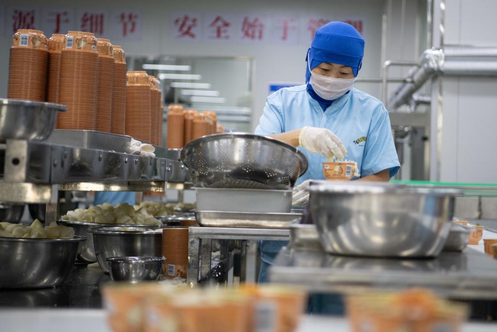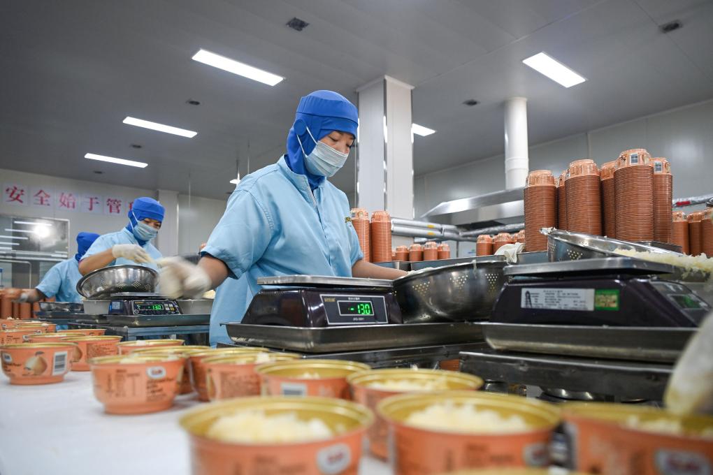 9月18日、碭山県の食品企業、安徽竜潤堂生物科技で、伝統的な梨のドリンク「小吊梨湯」を製造する従業員。(宿州=新華社配信/崔猛)