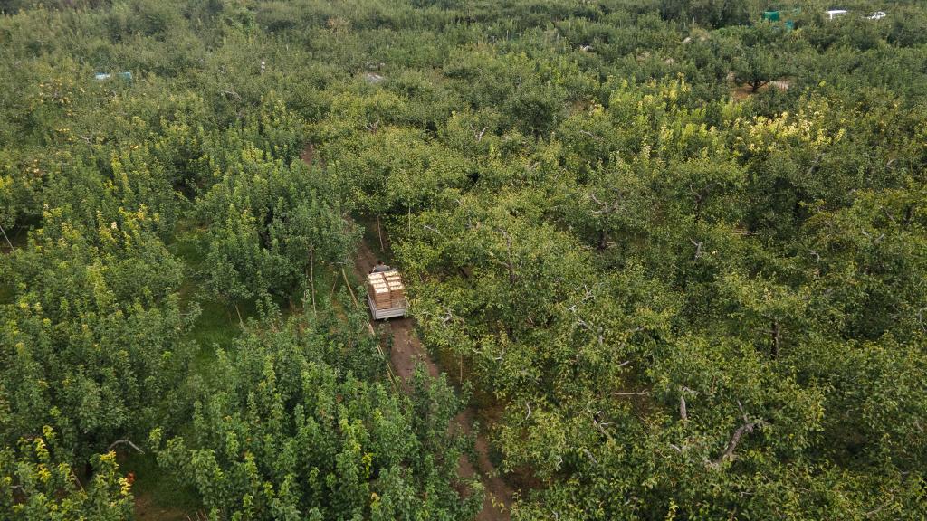 9月20日、碭山県の梨園で、収穫した酥梨を運ぶトラック。(ドローンから、宿州=新華社記者/張端)