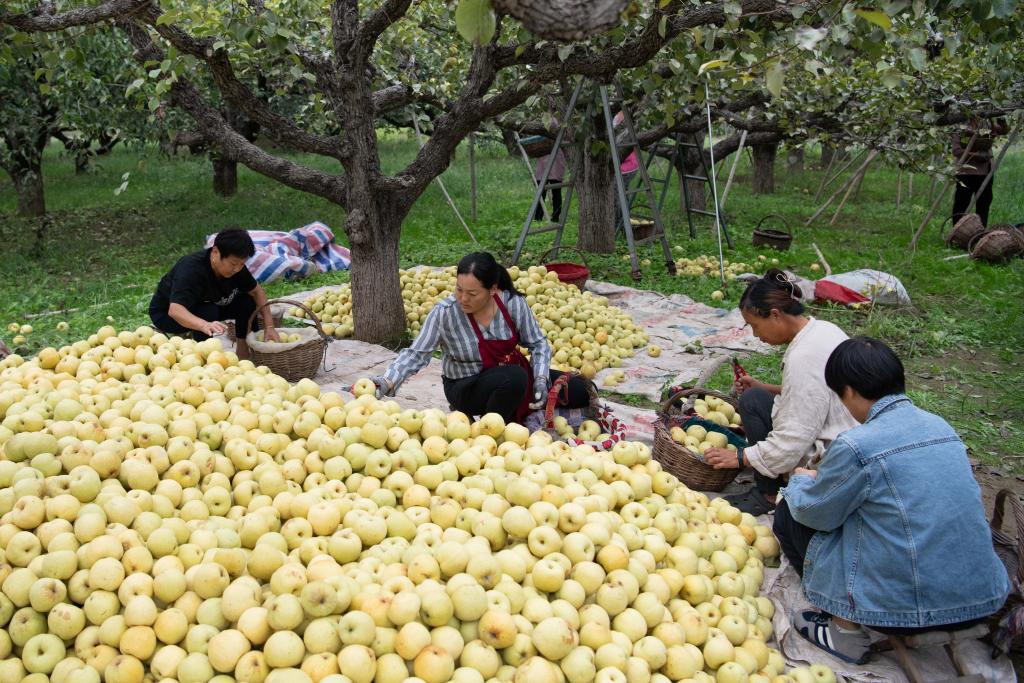 9月18日、碭山県の梨園で、酥梨を仕分ける農家の人たち。(宿州=新華社記者/張端)