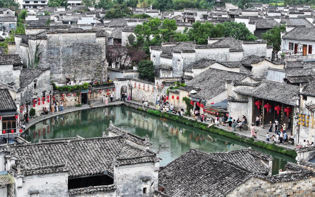 1日、宏村を散策する観光客。(ドローンから、黄山=新華社記者/杜宇)