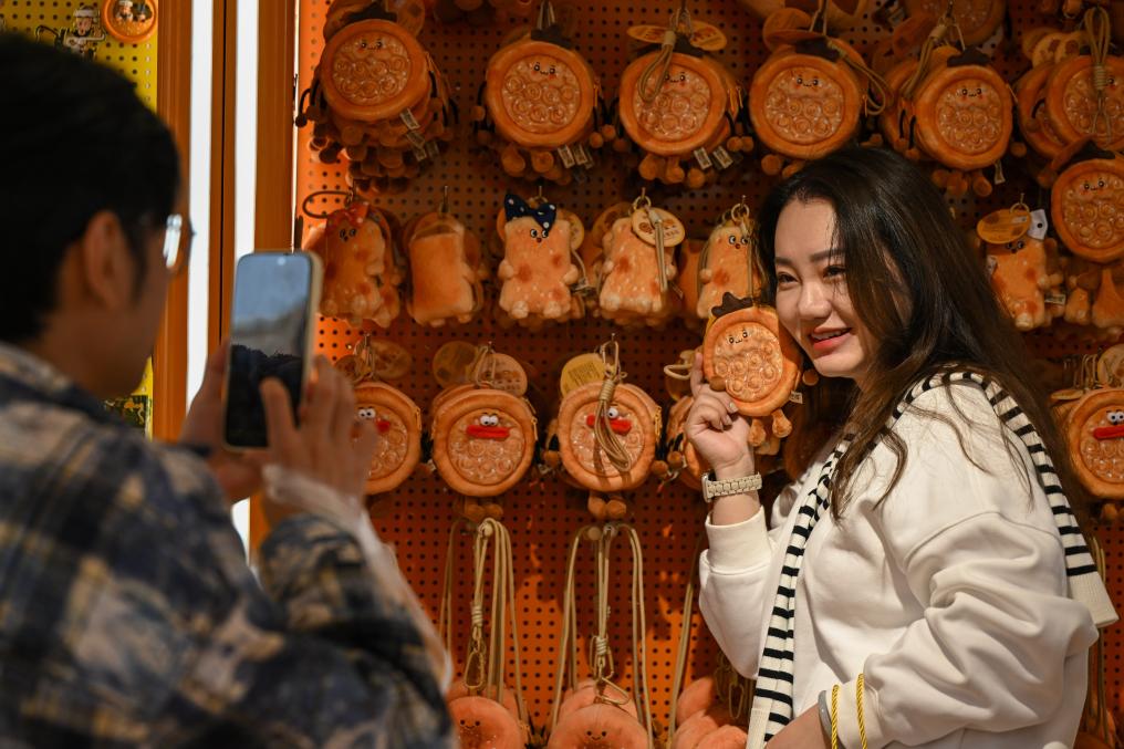 1日、新疆国際大バザールの土産物店で記念撮影する観光客。(ウルムチ=新華社記者/丁磊)