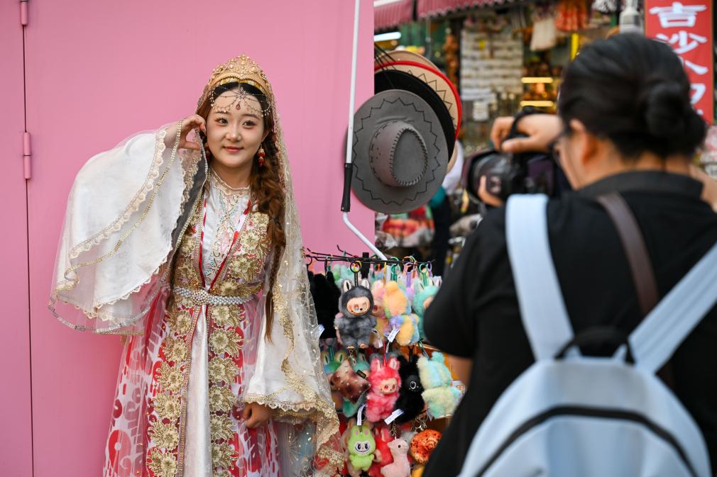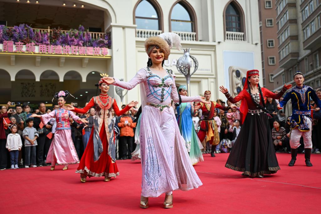 1日、新疆国際大バザールで行われたパフォーマンスを楽しむ観光客。(ウルムチ=新華社記者/丁磊)