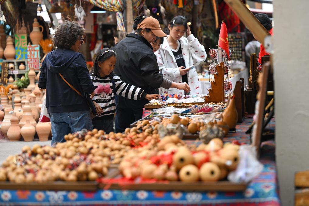 1日、新疆国際大バザールで商品を選ぶ観光客。(ウルムチ=新華社記者/丁磊)