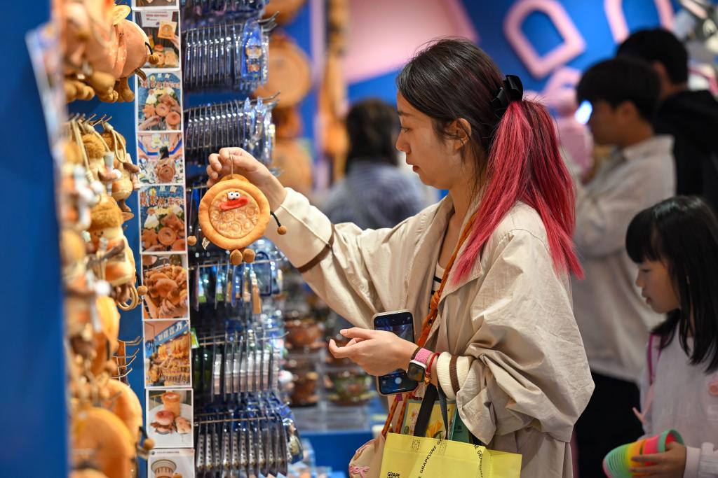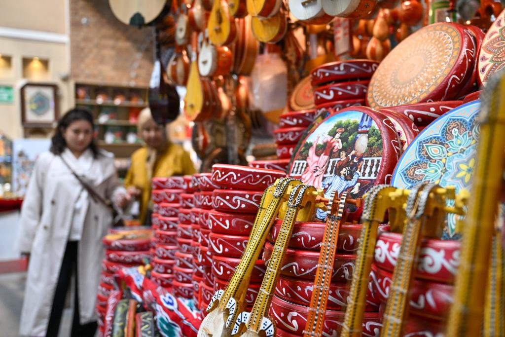 1日、新疆国際大バザールの土産物店で商品を選ぶ観光客。(ウルムチ=新華社記者/丁磊)