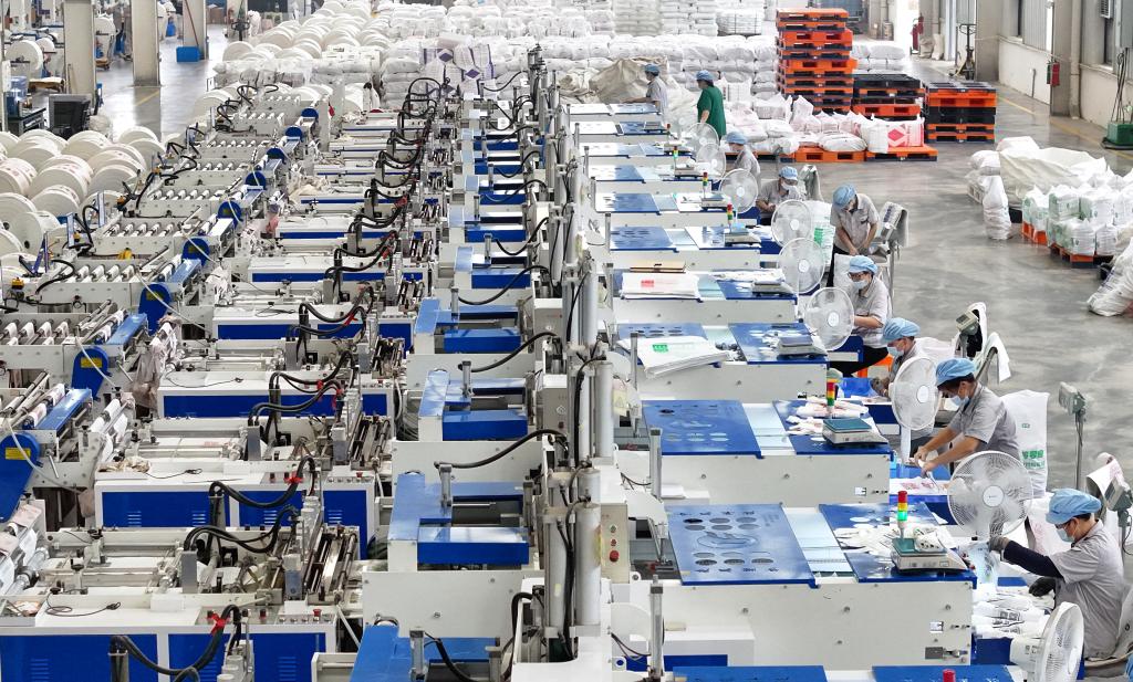 1日、湖南省衡陽市衡山県経済開発区のプラスチックメーカー、栄宸塑業の工場で作業する従業員。(ドローンから、北京=新華社配信/曹正平)