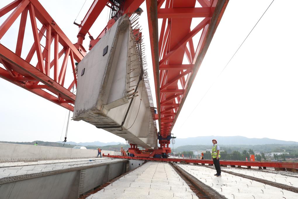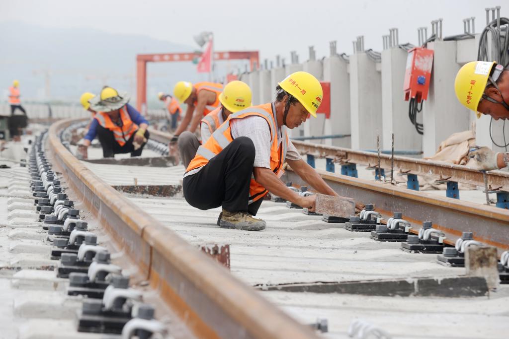 1日、浙江省湖州市徳清県の杭徳市域鉄道建設現場で、軌道を敷設する中鉄十一局集団の作業員。(北京=新華社配信/謝尚国)