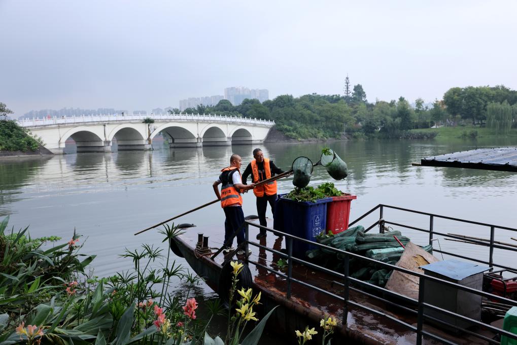 1日、四川省眉山市東坡区の東坡湖で、水草を回収する清掃作業員。(北京=新華社配信/姚永亮)
