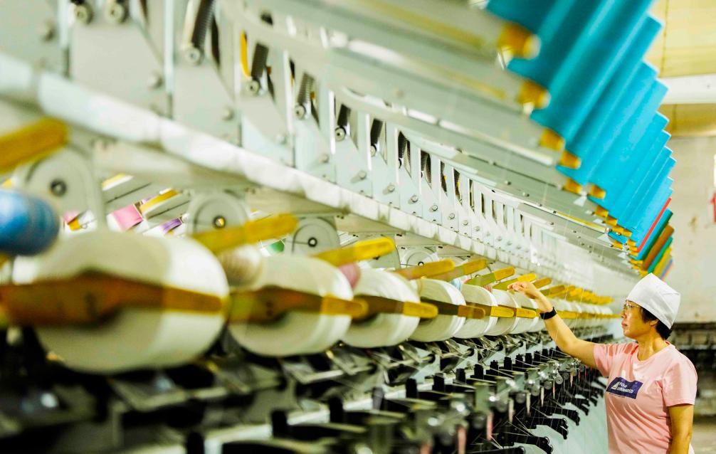 1日、河北省遵化市の化学繊維メーカー、遵化市高強化繊の工場で働く従業員。(北京=新華社配信/劉満倉)