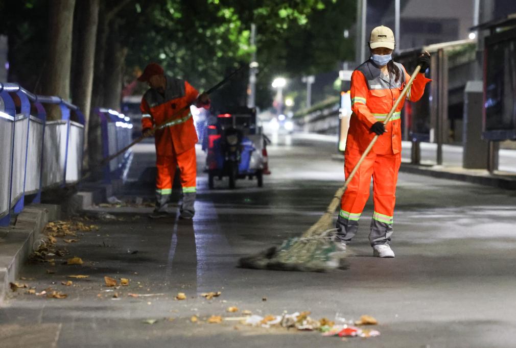 1日、河北省石家荘市新華区の中華大街で、道路を清掃する作業員。(北京=新華社配信/梁子棟)