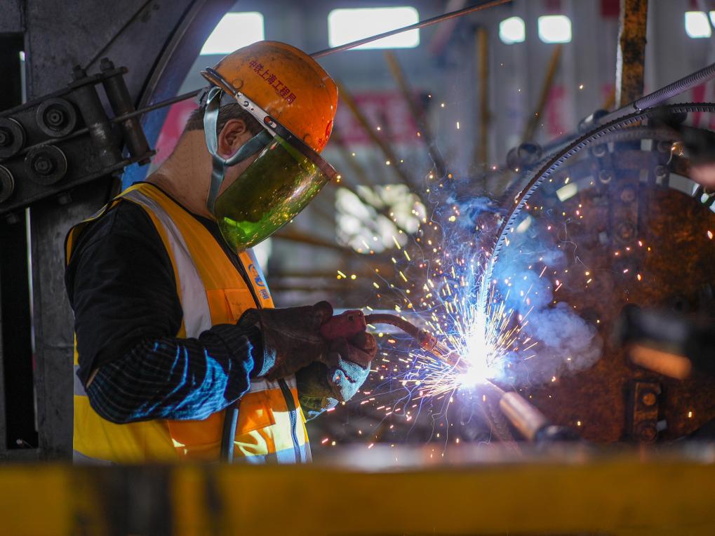1日、江蘇省興化市陳堡鎮の中鉄上海工程局塩宜鉄道プロジェクト鉄筋加工場で、溶接作業に当たる従業員。(北京=新華社配信/周社根)