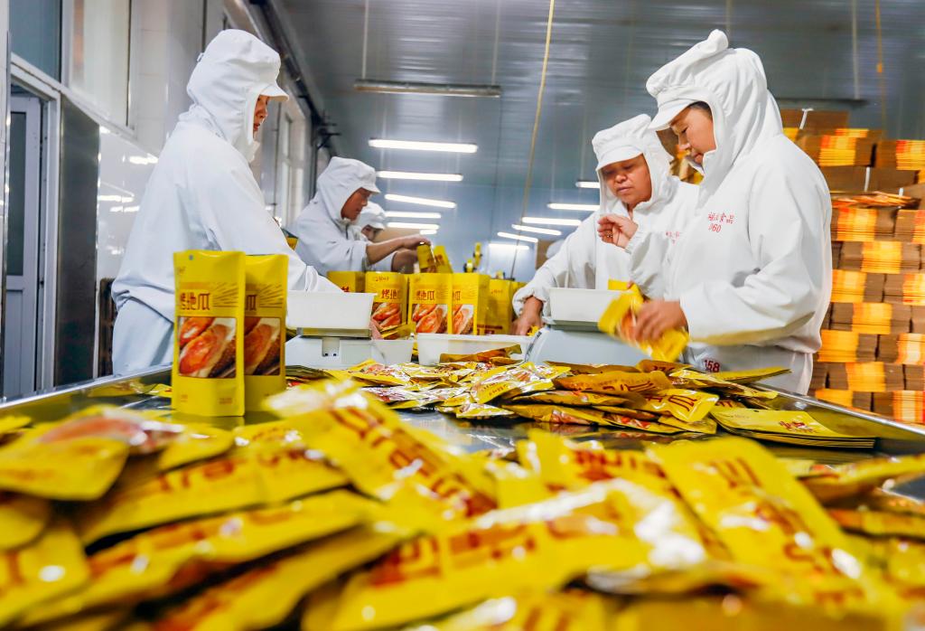 1日、河北省遵化市蘇家窪(そかわ)鎮にある食品加工メーカーの包装工場で働く従業員。(北京=新華社配信/劉満倉)