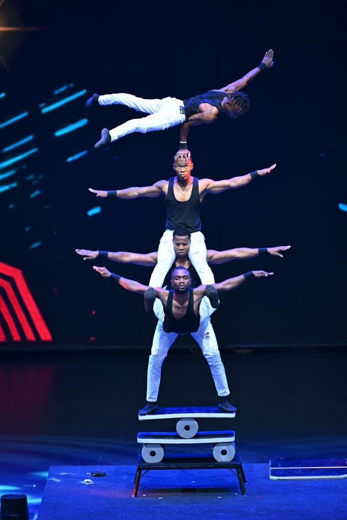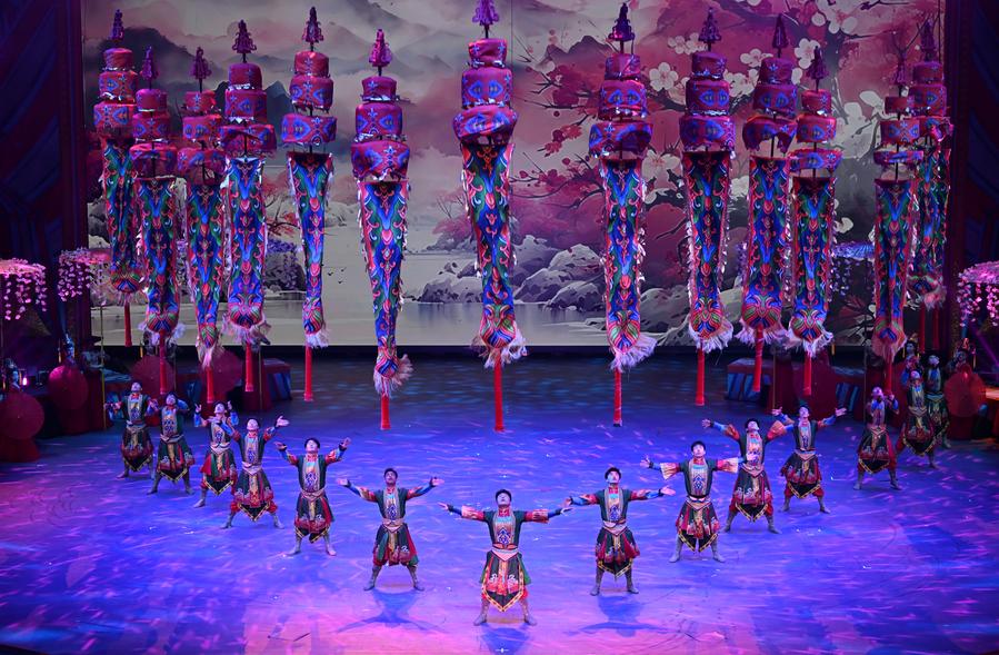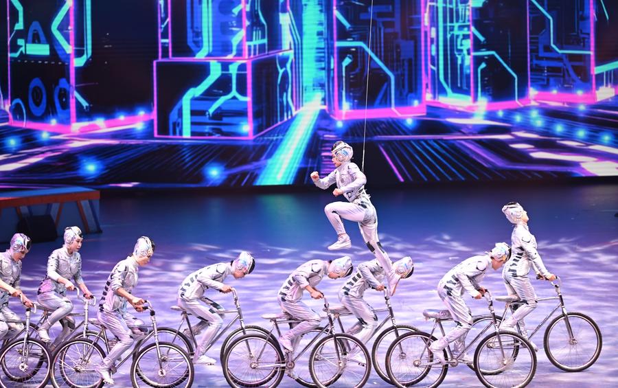 9月28日、第20回中国呉橋国際雑技芸術の開幕式で技を披露する演技者。(呉橋=新華社記者/牟宇)
