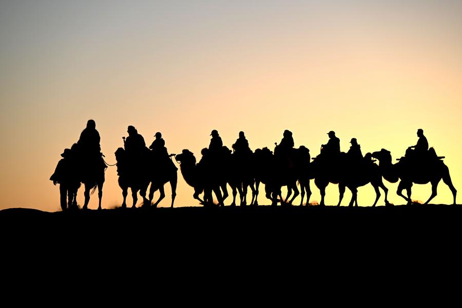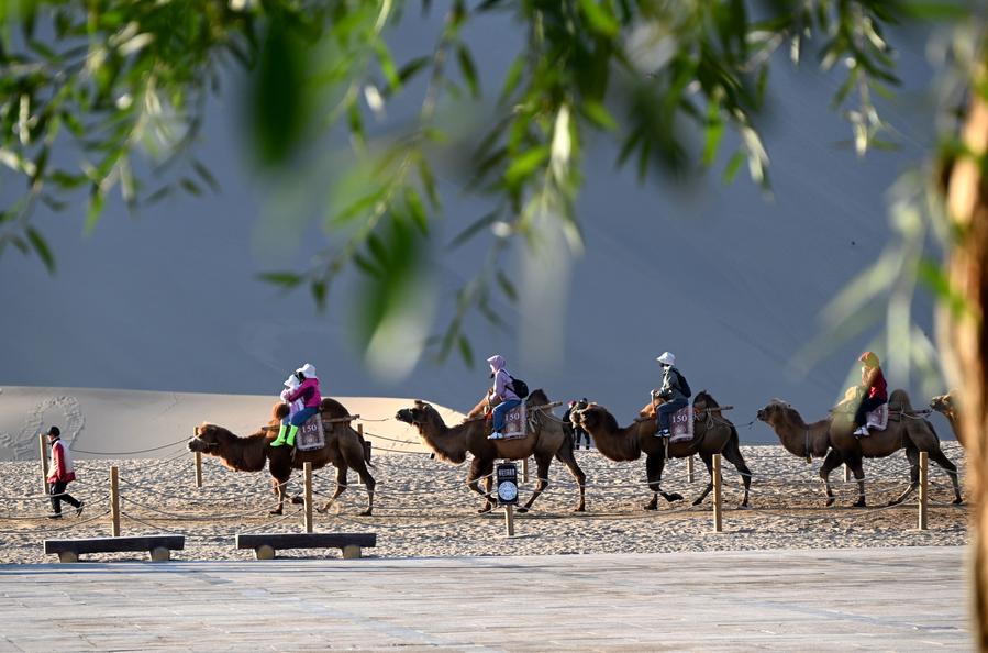 1日、甘粛省敦煌市の鳴沙山・月牙泉風景区をラクダで遊覧する観光客。(敦煌=新華社配信/張暁亮)