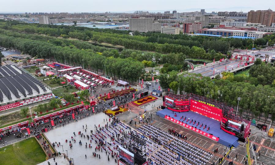 1日、寧夏回族自治区呉忠市利通区の牛家坊民俗文化村で開かれた「第5回呉忠早茶美食文化祭」の様子。(ドローンから、呉忠=新華社記者/馮開華)