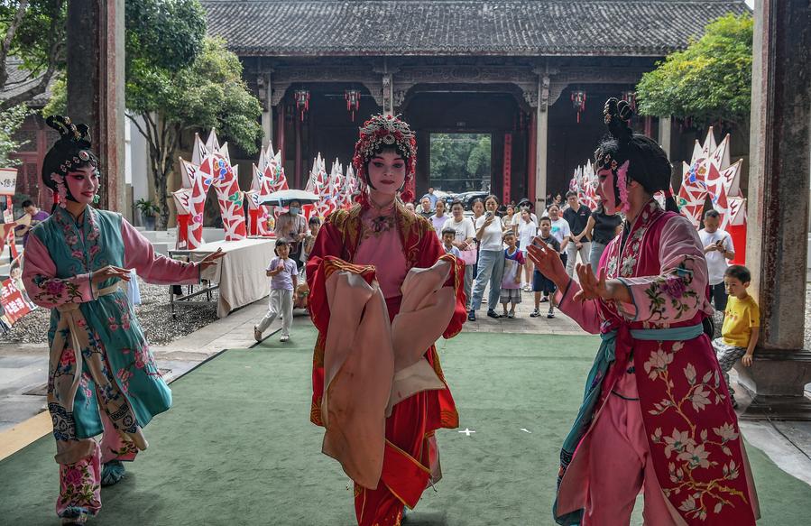 1日、浙江省金華市の無形文化遺産館で、伝統劇「婺劇(ぶげき)」の演目「梳妝」を披露する浙江婺劇芸術研究院の役者たち。(金華=新華社配信/時寛兵)