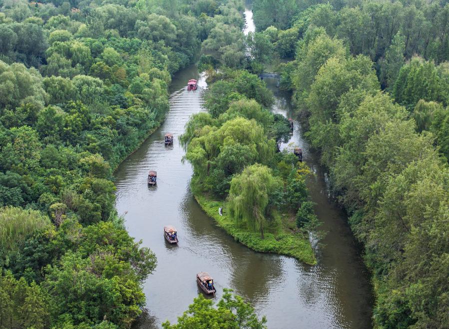 1日、江蘇省泰州市姜堰区の溱湖国家湿地公園を行き交う遊覧船。(ドローンから、泰州=新華社配信/周社根)
