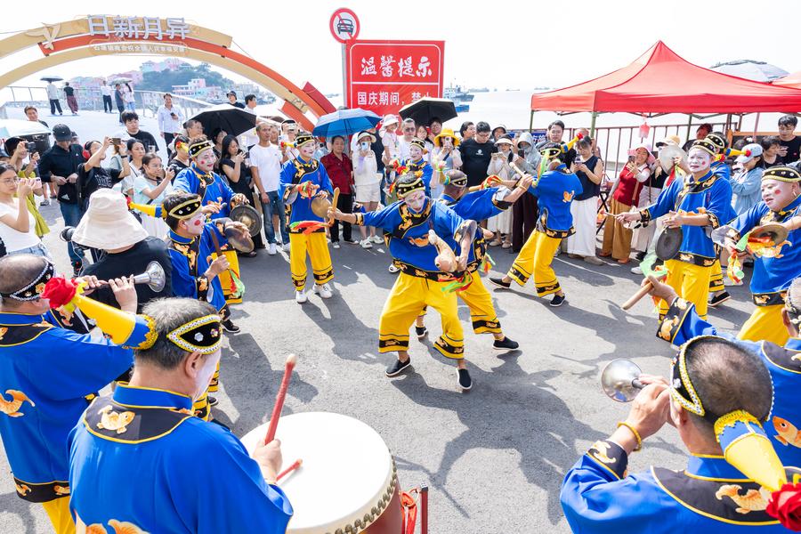 1日、浙江省温嶺市石塘鎮の海辺で大奏鼓の演奏を楽しむ観光客。(温嶺=新華社配信/徐偉傑)