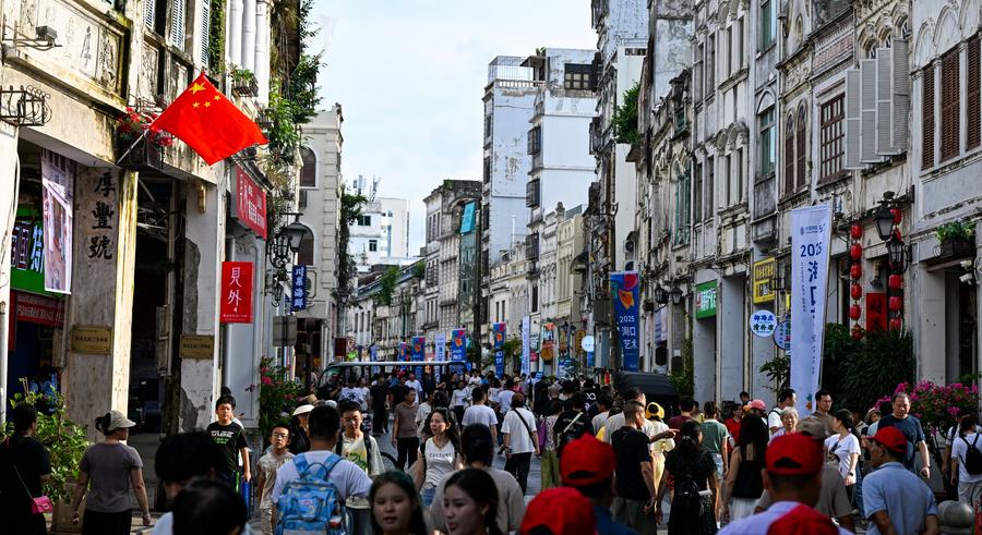 1日、海南省海口市の騎楼老街を散策する観光客。(海口=新華社記者/楊冠宇)