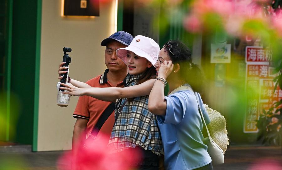 1日、海南省海口市の騎楼老街で記念撮影する観光客。(海口=新華社記者/楊冠宇)