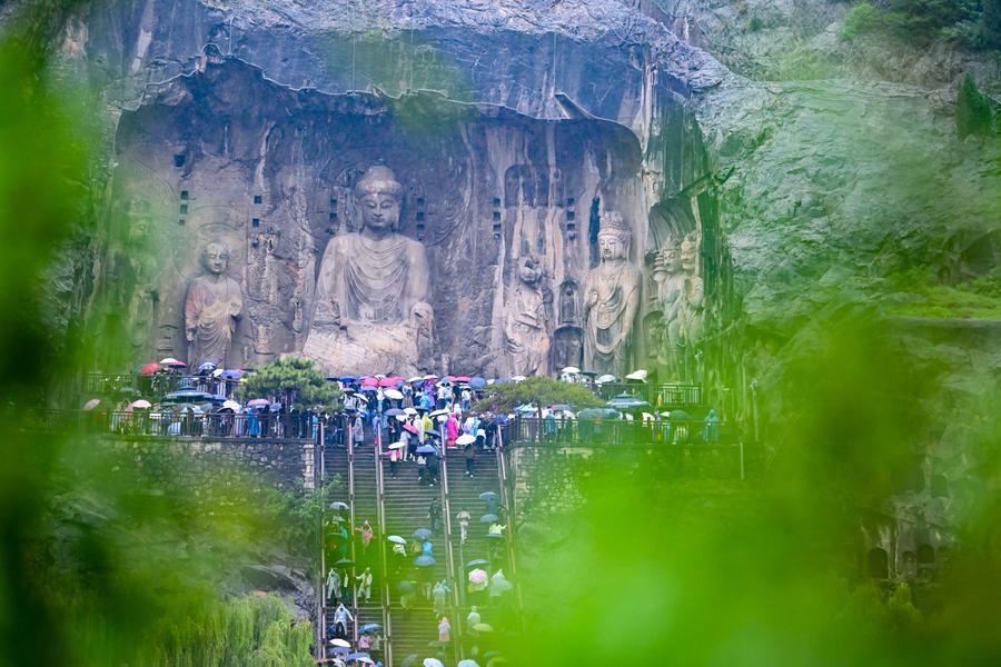 1日、雨の中、大勢の観光客を迎える河南省洛陽市の竜門石窟。(洛陽=新華社配信/李衛超)