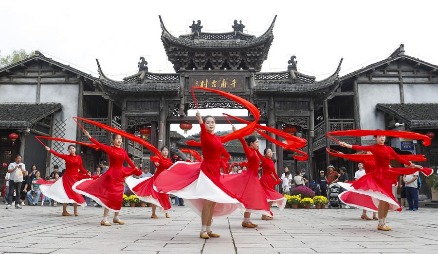 1日、江蘇省句容市の宝華山国家森林公園でパフォーマンスを披露する出演者。(句容=新華社配信/鐘学満)
