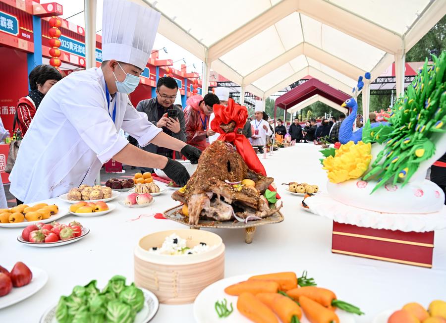 1日、寧夏回族自治区呉忠市利通区の牛家坊民俗文化村で開かれた「第5回呉忠早茶美食文化祭」の料理コンテストで、名物料理を紹介するシェフ。(呉忠=新華社記者/馮開華)