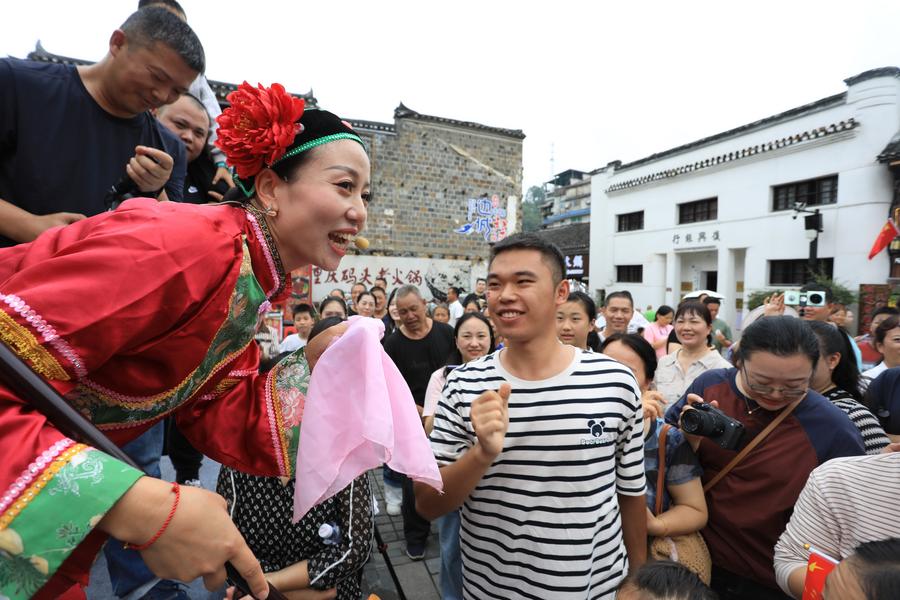 1日、重慶市秀山トゥチャ族ミャオ族自治県洪安古鎮の旧市街で、トゥチャ族の婚礼習俗の演出を見る観光客。(重慶=新華社配信/胡程)