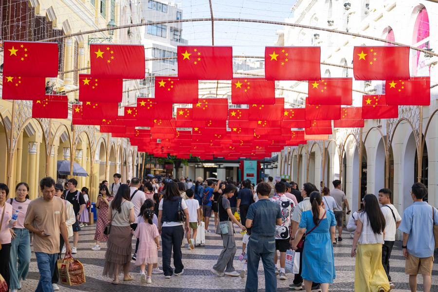 2日、マカオのセナド広場を散策する観光客。(マカオ=新華社配信/張金加)
