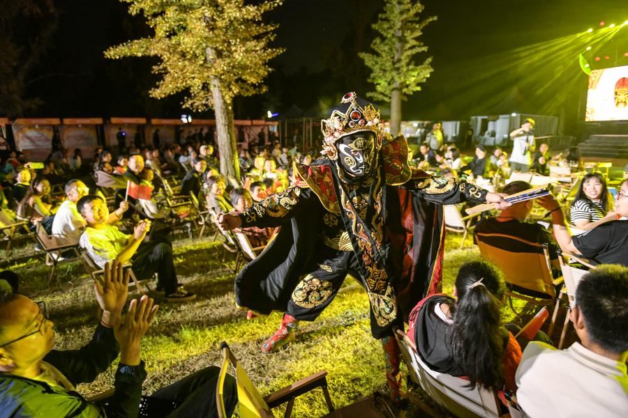 1日、四川省成都市新都ハイテク産業パークの「沐光森林」キャンプ地で、同省の伝統劇「川劇」の変臉(へんれん=隈取りの仮面の早変わり)を披露する俳優。(成都=新華社配信/李向雨)
