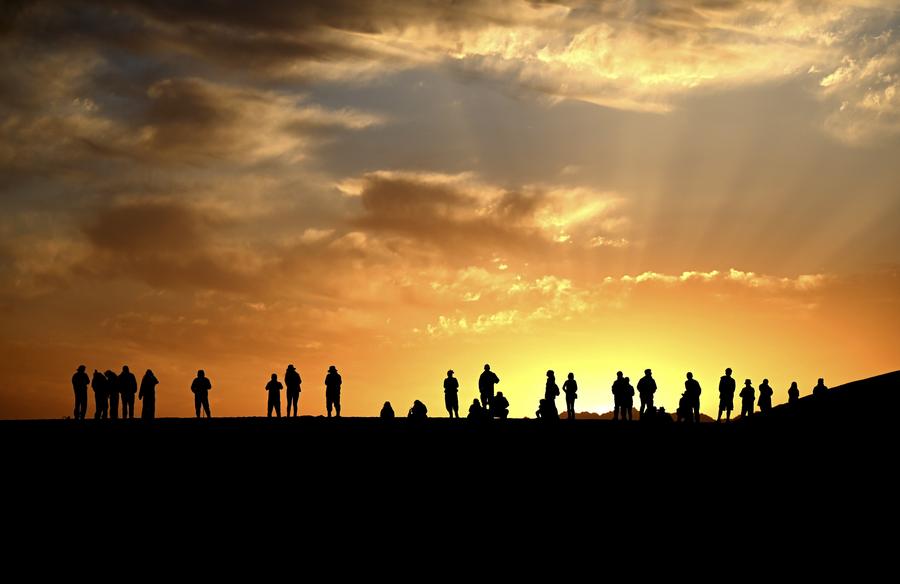 2日、甘粛省敦煌市の鳴沙山・月牙泉風景区で砂漠の日の出を観賞する観光客。(敦煌=新華社配信/張暁亮)