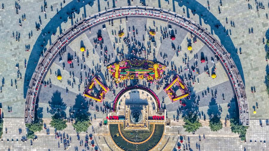 2日、黒竜江省ハルビン市の防洪勝利記念塔広場で遊ぶ観光客。(ドローンから、ハルビン=新華社配信/陳南)