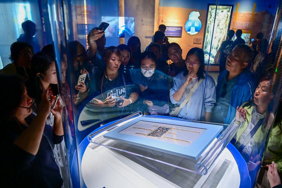 2日、新疆ウイグル自治区博物館で、館の至宝とされる漢代の絹織物製腕当て「五星出東方利中国」を見学する観光客。(ウルムチ=新華社記者/丁磊)