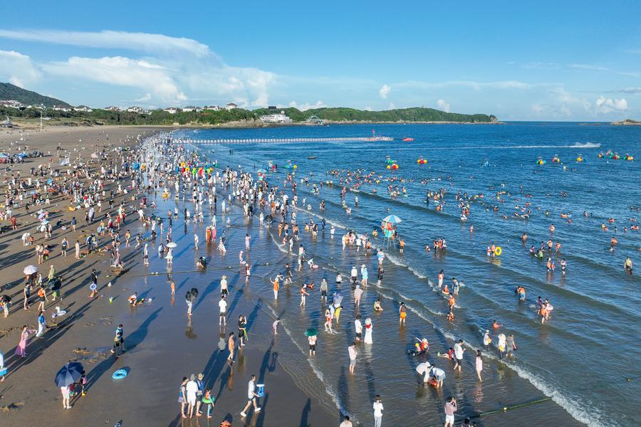 2日、浙江省舟山市の朱家尖南沙風景区で水遊びをする観光客。(ドローンから、舟山=新華社配信/鄒訓永)