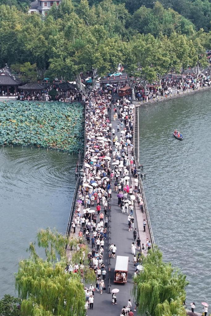 2日、浙江省杭州市の西湖に架かる断橋を渡る大勢の観光客。(ドローンから、杭州=新華社配信/竜巍)