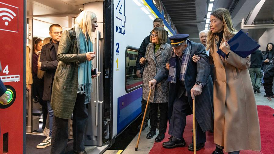 3日、職員に付き添われ、ハンガリー・セルビア鉄道の列車に乗る105歳のセルビア人男性(右から2人目)。(スボティツァ=新華社配信/王韡)