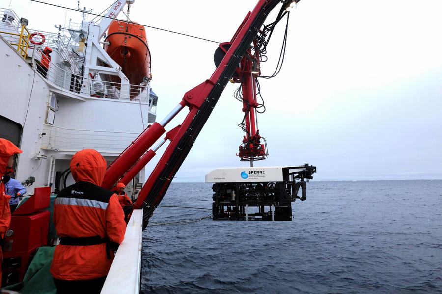 「深海1号」から海中に投入される遠隔操作型無人潜水艇(ROV)。(8月7日撮影、北京=新華社記者/劉詩平)