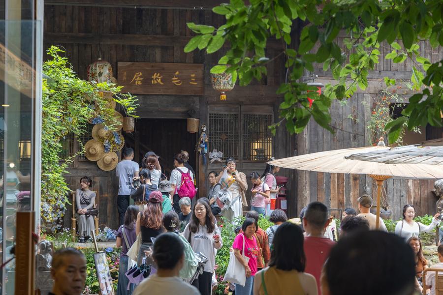 2日、重慶市南岸区の黄桷垭老街で作家、三毛の生家を見学する観光客。(重慶=新華社記者/黄偉)