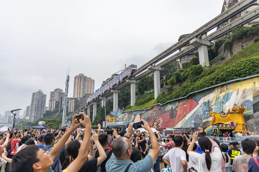 3日、重慶市渝中区の李子壩(りしは)展望台で、高層マンションを通り抜けるモノレールを撮影する観光客。(重慶=新華社記者/黄偉)