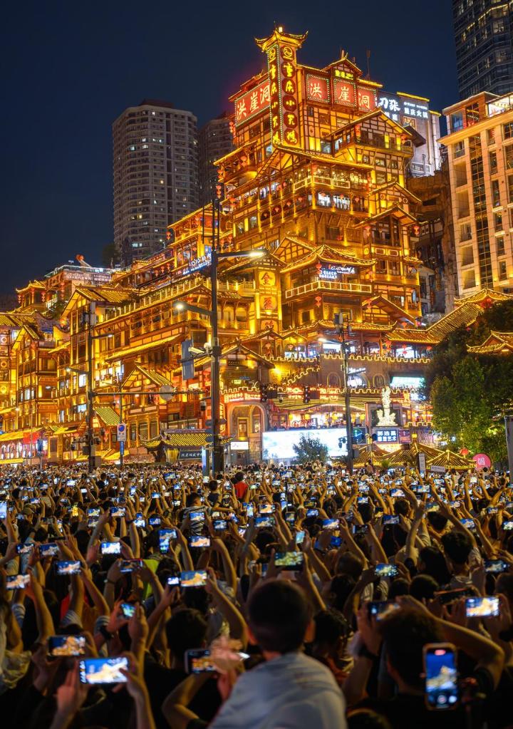 3日、観光客でにぎわう重慶市渝中区の洪崖洞風景区。(重慶=新華社配信/郭旭)
