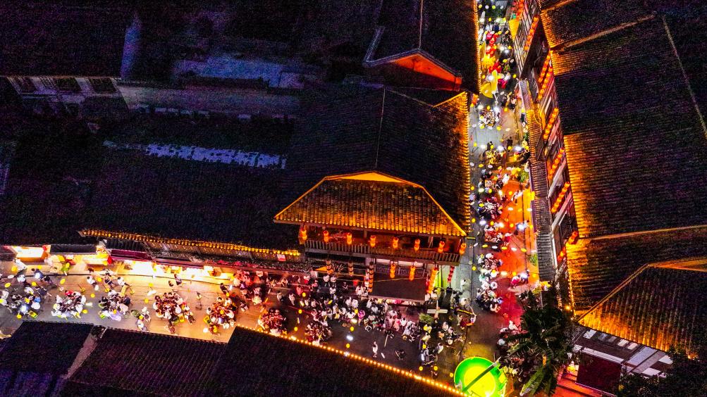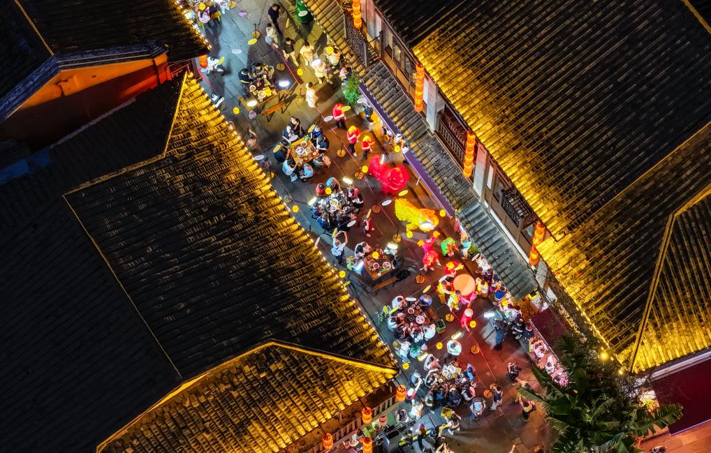 5日、重慶市の磁器口古鎮で開かれた長街宴。(ドローンから、重慶=新華社記者/王全超)