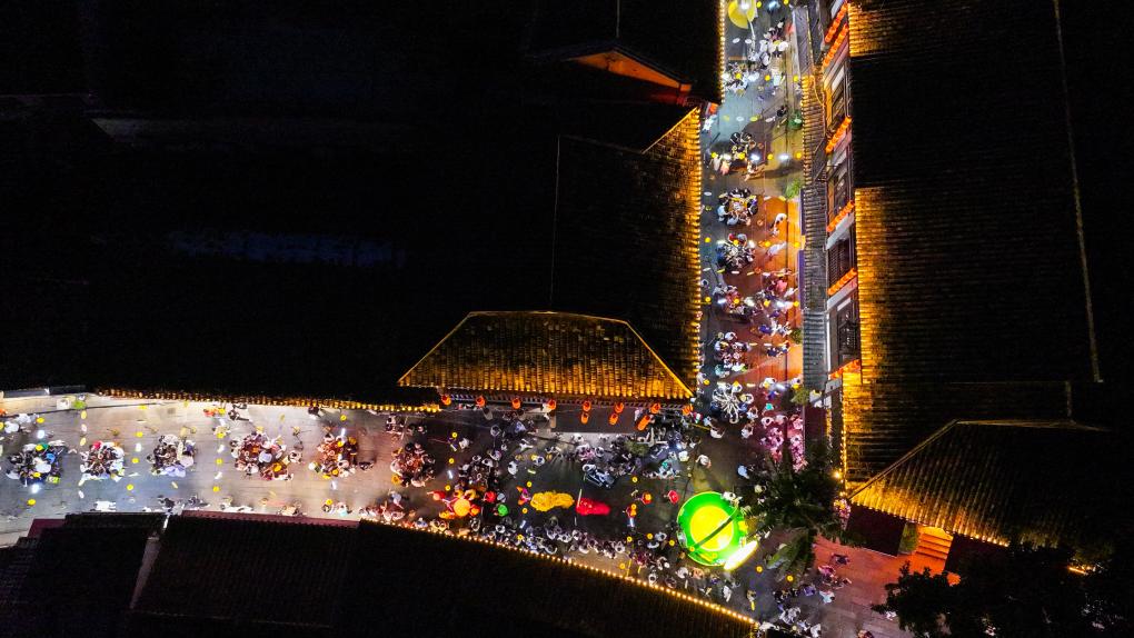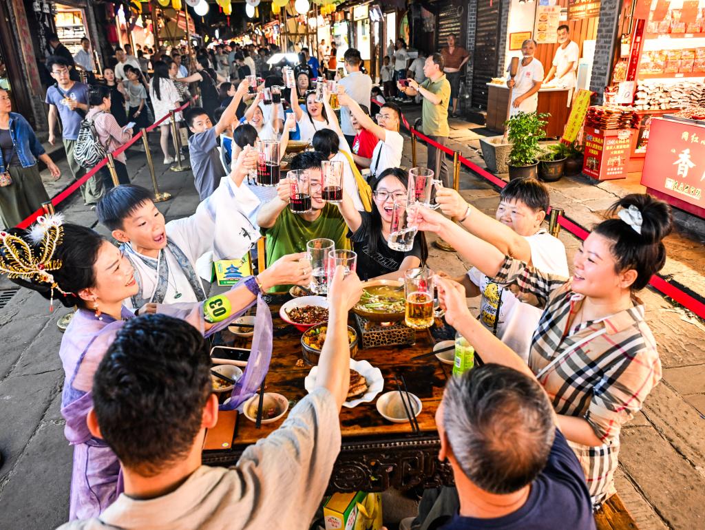 【新華社重慶10月6日】中国重慶市の磁器口古鎮で5日、長い通りに宴席が並ぶ「長街宴」が開かれ、多くの観光客が料理や民俗芸能を楽しみながら旧暦8月15日の中秋節(今年は10月6日)を祝った。