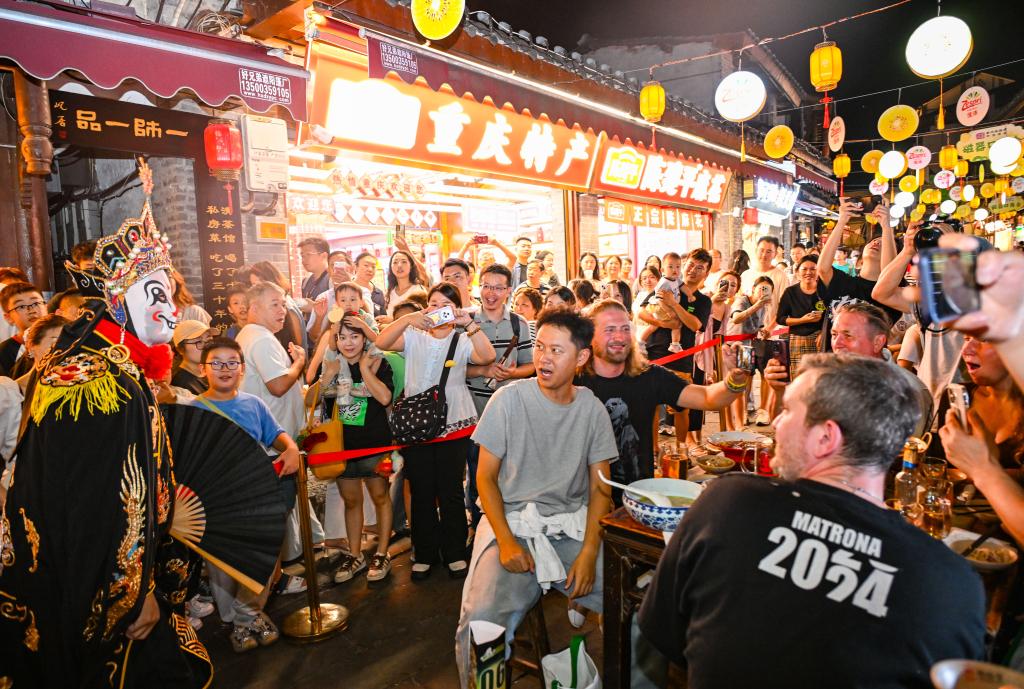 5日、重慶市磁器口古鎮で開かれた長街宴で、観光客に伝統芸能の「変面」を披露する「川劇(四川演劇)」の役者(中央)。(重慶=新華社記者/王全超)