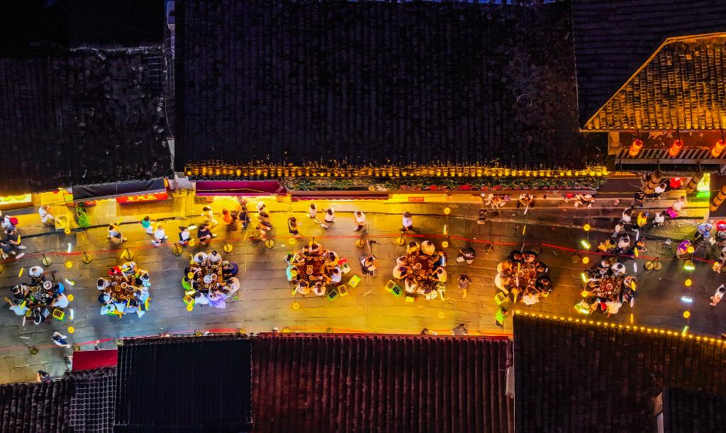 5日、重慶市磁器口古鎮で開かれた長街宴。(ドローンから、重慶=新華社記者/王全超)
